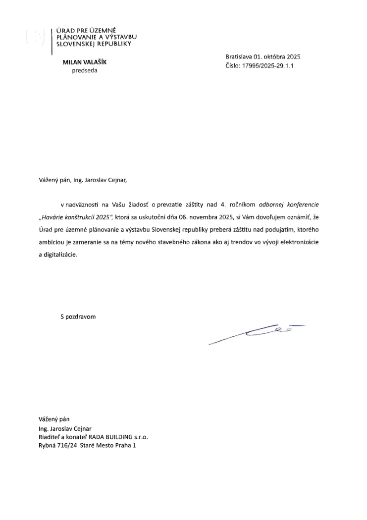 Záštitu nad konferencí Havárie konstrukcí 2025 poskytl Jozef Ráž, ministr dopravy Slovenské republiky